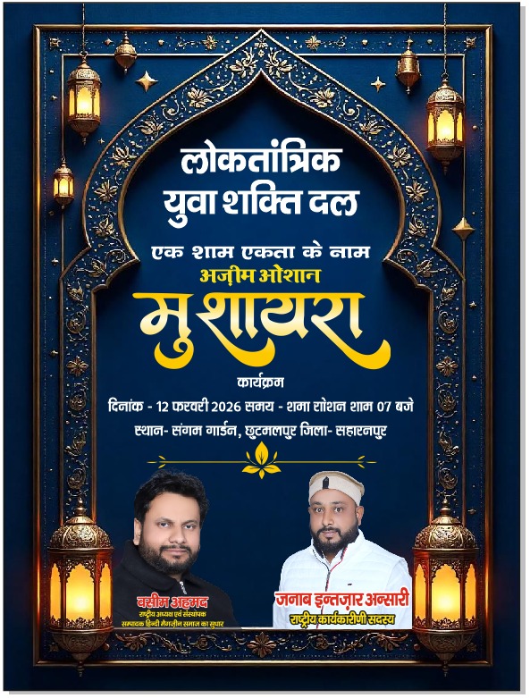 लोकतान्त्रिक युवा शक्ति दल द्वारा शहर में आपसी भाईचारे, सांस्कृतिक एकता और साहित्यिक परंपराओं को बढ़ावा देने के उद्देश्य से एक भव्य मुशायरे का आयोजन किया जा रहा है। यह कार्यक्रम कल यानि 12 फरवरी को संगम गार्डन छुटमलपुर में आयोजित किया जायेगा। शमा रोशन शाम 7 :00 बजे की जाएगी। मुशायरे में प्रसिद्ध शायर और कवि अपनी रचनाओं से श्रोताओं को मंत्रमुग्ध करेंगे।