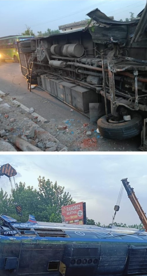 डबल डेकर वोल्वो बस पुलिस चौकी पर पलटी-होमगार्ड समेत छह घायल