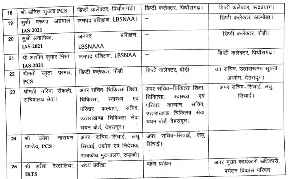 उत्तराखंड शासन में आज बड़े पैमाने पर प्रशासनिक फेरबदल किया है 11 आईएएस समेत कई पीसीएस अफसरो का तबादला किया गया। साथ ही कुछ अधिकारियों की जिम्मेदारी में भी बदलाव किया गया है। इन अधिकारियों में देहरादून के नगर आयुक्त, कई जिलों के सीडीओ व ज्वाइंट मजिस्ट्रेट बदल दिए गए हैं। हरिद्वार, चमोली, अल्मोड़ा, रुद्रप्रयाग, पिथौरागढ़ पौड़ी जिलों को नए डिप्टी कलेक्टर मिले हैं। वहीं एक आई आर टी एस अधिकारी को भी जिम्मेदारी दी गई है।