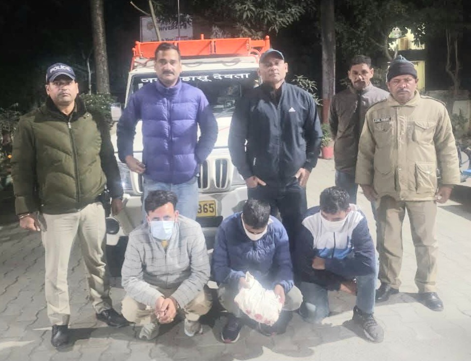 उत्तराखण्ड एसटीएफ की एण्टी नारकोटिक्स टास्क फोर्स द्वारा थाना विकासनगर देहरादून पुलिस के साथ संयुक्त अभियान में आज सुबह थाना विकासनगर देहरादून क्षेत्र से 3 अभियुक्तों- दिनेश पुत्र भोपालू नि0 ग्राम जिसऊ घराना तहसील कालसी जनपद देहरादून (उम्र 26 वर्ष), कुन्दन चौहान पुत्र अमर सिंह नि0 ग्राम सूर्यो तहसील कालसी जनपद देहरादून और पंकज पुत्र सरदार सिंह नि0 ग्राम सूर्यो तहसील कालसी जनपद देहरादून (उम्र 25 वर्ष) को 1.505 किग्रा0 चरस परिवहन करते हुए मय वाहन के गिरफ्तार किया गया। अभियुक्तों से पूछताछ करने पर बताया गया कि वह यह चरस पहाड़ी क्षेत्र से सस्ते दामों में लाकर विकासनगर क्षेत्र में ऊंचे दामों में बेचकर अधिक मुनाफा कमाते हैं |