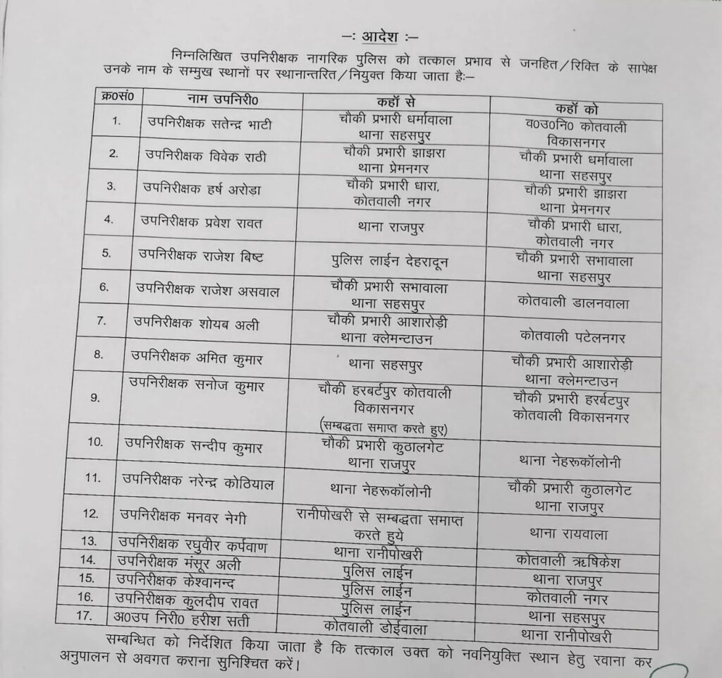 - उपनिरीक्षक राजेश असवाल को चौकी प्रभारी सभावाला थाना सहसपुर से कोतवाली डालनवाला भेजा गया है।