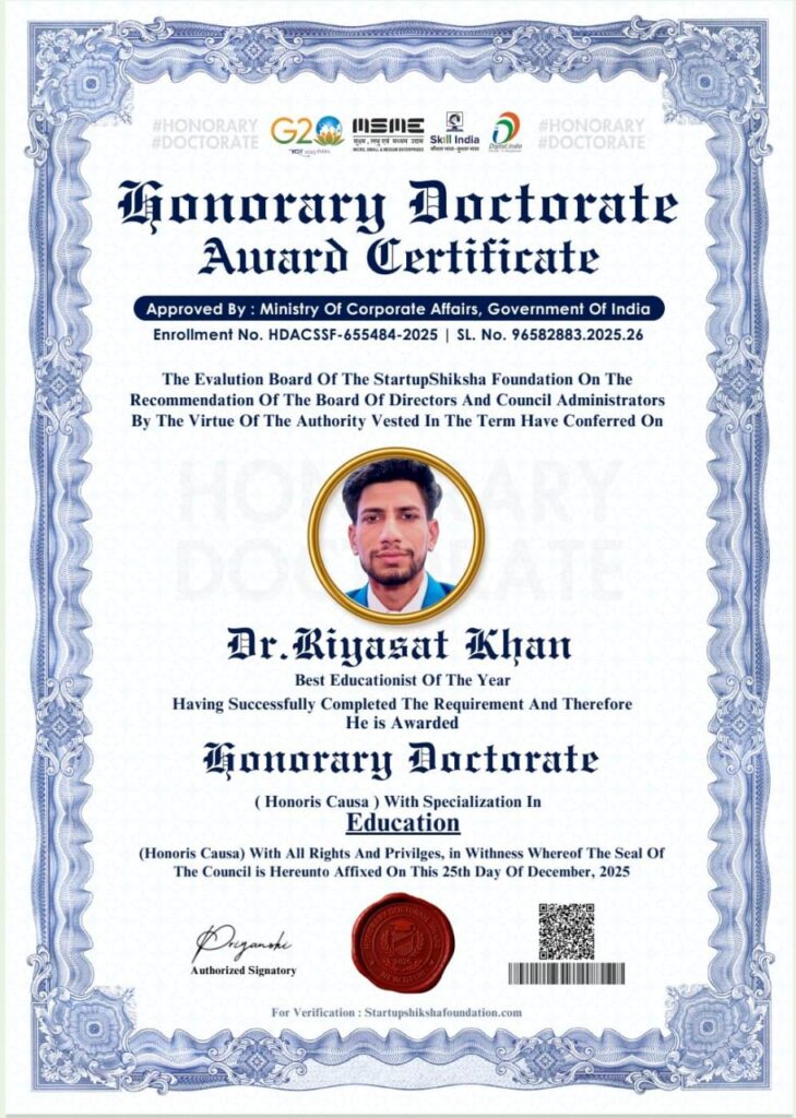 स्टार्टअप शिक्षा फाउंडेशन के इवैल्यूएशन बोर्ड ने शिक्षा के क्षेत्र में महत्वपूर्ण बदलाव लाने और उत्कृष्ट सेवा प्रदान करने के लिए अटकफार्म सेलाकुई निवासी रियासत खान को ‘मानद डॉक्टरेट’ की उपाधि से सम्मानित किया है। यह सम्मान उन्हें ‘बेस्ट एजुकेशनिस्ट ऑफ द ईयर ‘ के रूप में उनकी विशिष्ट पहचान के लिए दिया गया है।