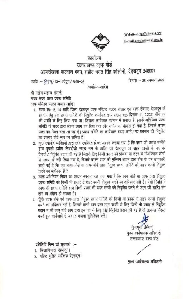 थम नहीं रहा देहरादून शहर काजी की नियुक्ति को लेकर विवाद, वक्फ बोर्ड ने जारी किये नये शहर काजी को हटाने के आदेश